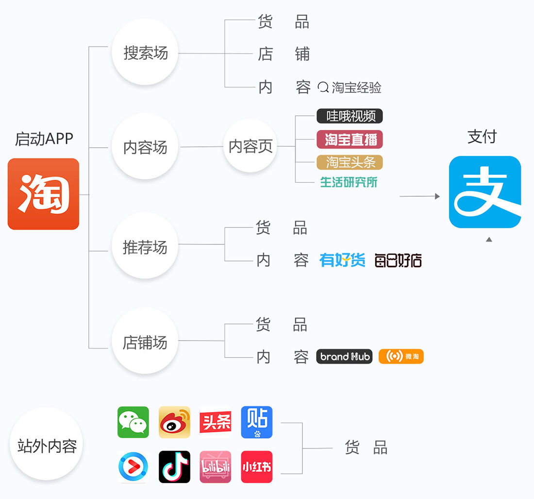 站内内容触点:洋淘秀、淘宝头条、大咖点评、淘宝经验问答、汇吃、微淘、猜你喜欢、短视频、有好货、美妆学院等